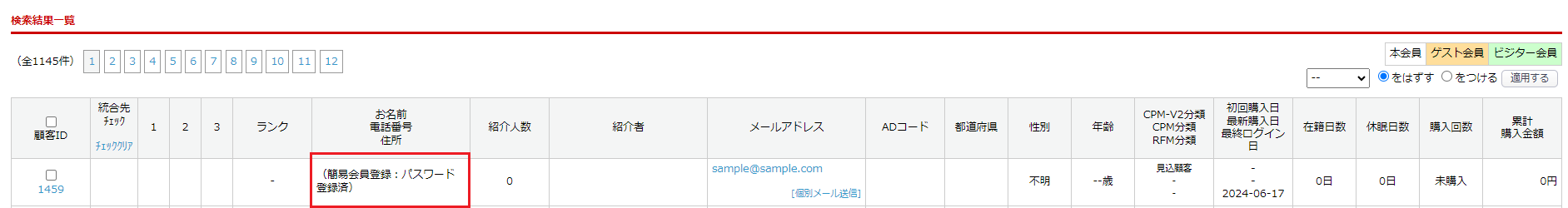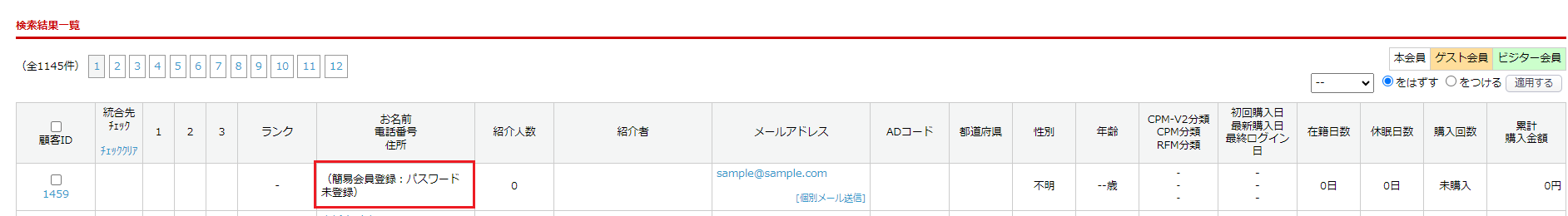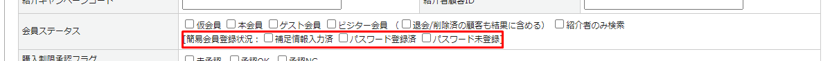 <顧客>顧客一覧>、<メルマガ管理>配信内容設定>および<運営管理>クーポン発行対象顧客の設定>の絞り込みパネルに、「会員ステータス:簡易会員登録状況」が追加されたため、簡易会員状態を絞り込むことができ、簡易会員でもメルマガ配信やクーポン発行が可能です。