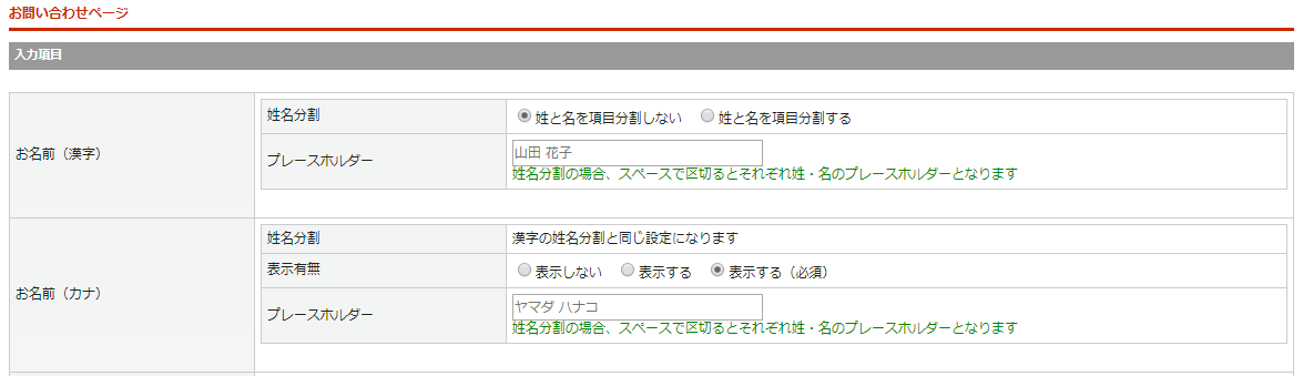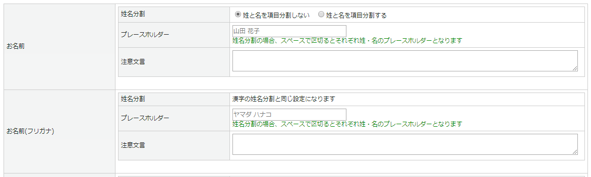 「お名前」の姓名分割で分割するかしないかを設定してください。