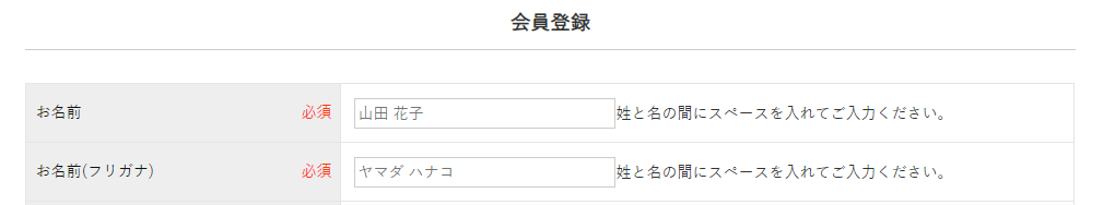 ※デフォルトではお名前入力欄は1つで姓と名の間にスペースをいれて入力する仕様です。