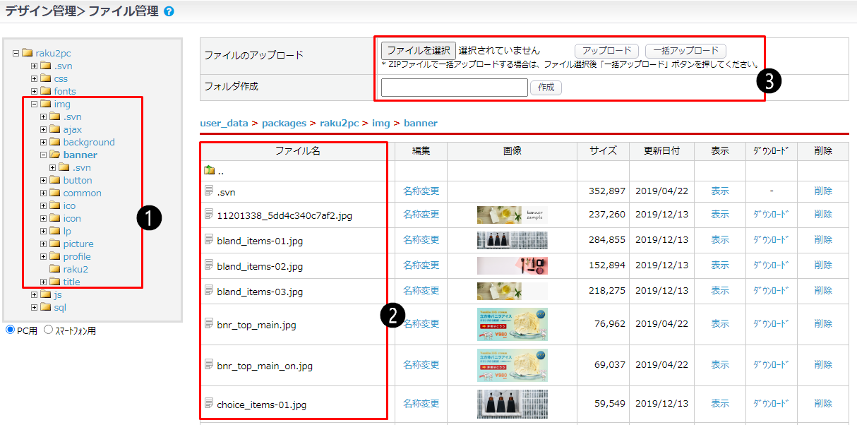 デザイン(PC/スマートフォン)>ファイル管理 よりアップロード可能です。