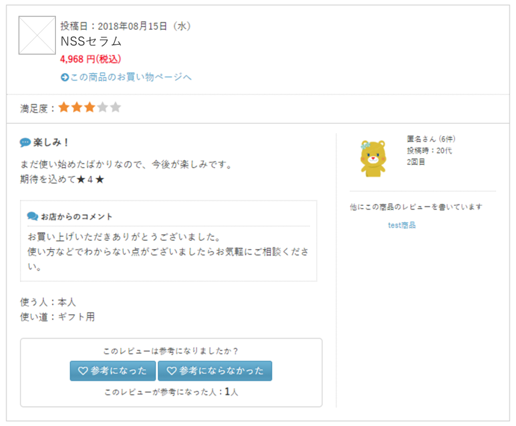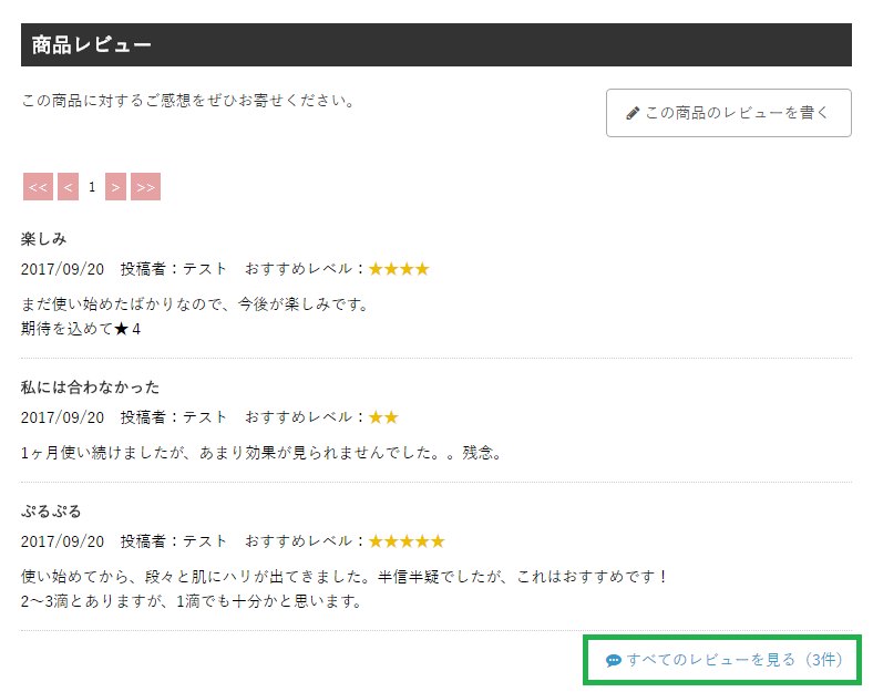 商品レビューが一覧で表示されます。また、一覧下部に、書き込み件数が表示されます。