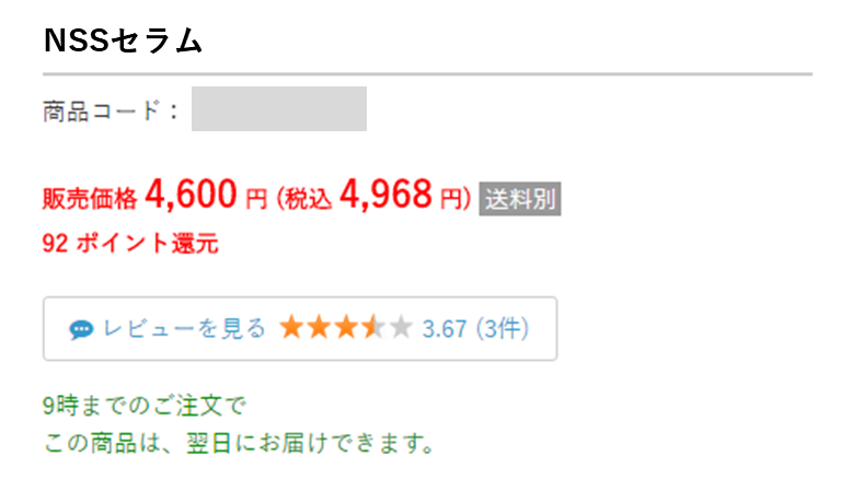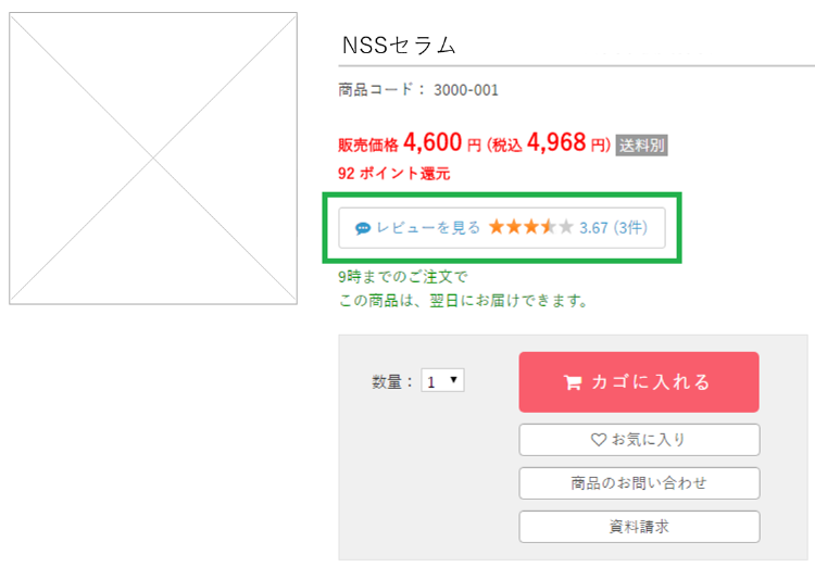レビューがある場合、商品詳細部分に、総合点数・書き込み件数が表示されます。