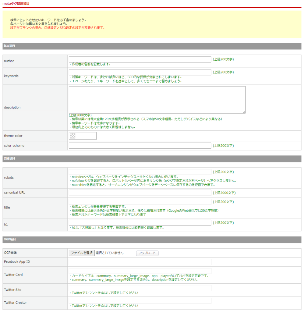| keywords | ページの内容を表すキーワードを半角カンマ(,)区切りで入力してください。 |