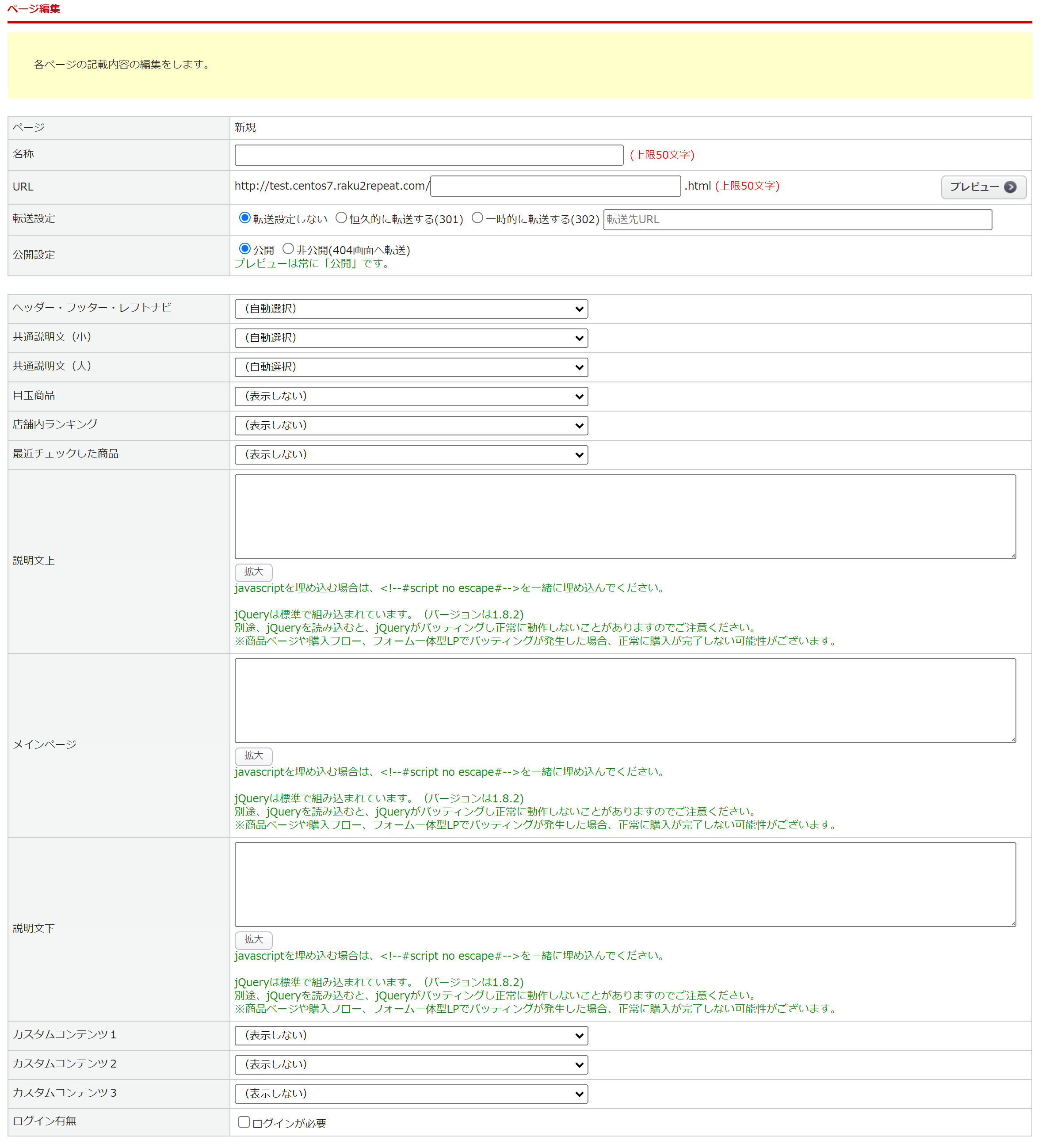 | ページ | 新規作成時は「新規」と表示されます。 登録後は自動で設定した内容が反映されます。 |