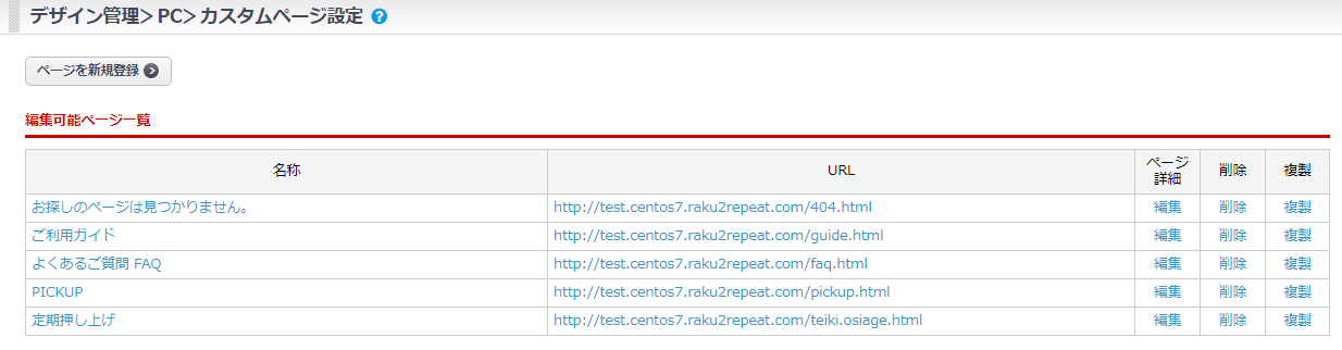 デザイン(PC/スマートフォン)>カスタムページ設定