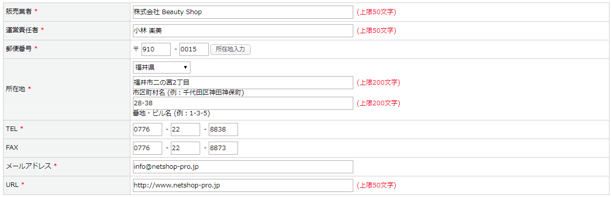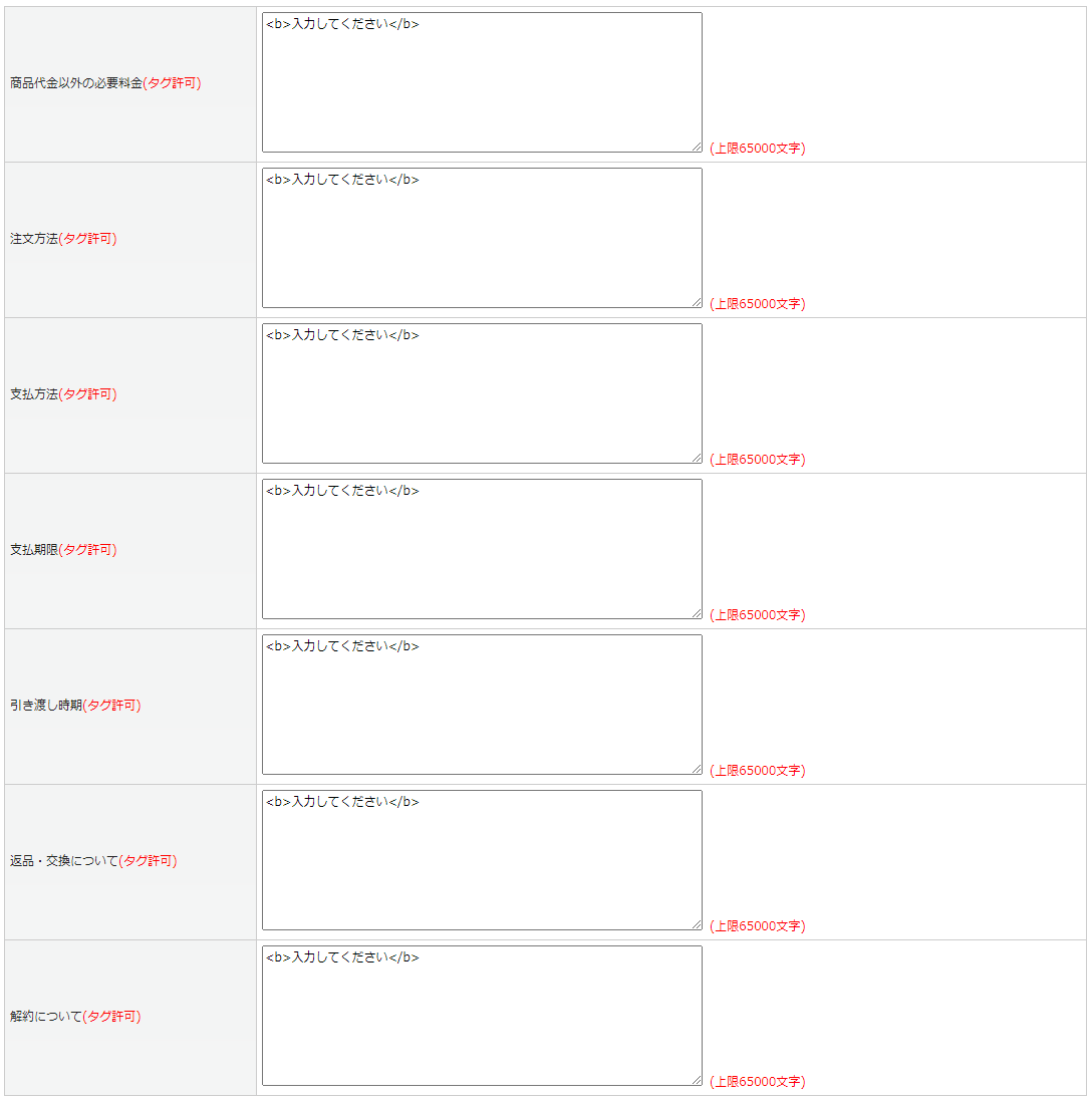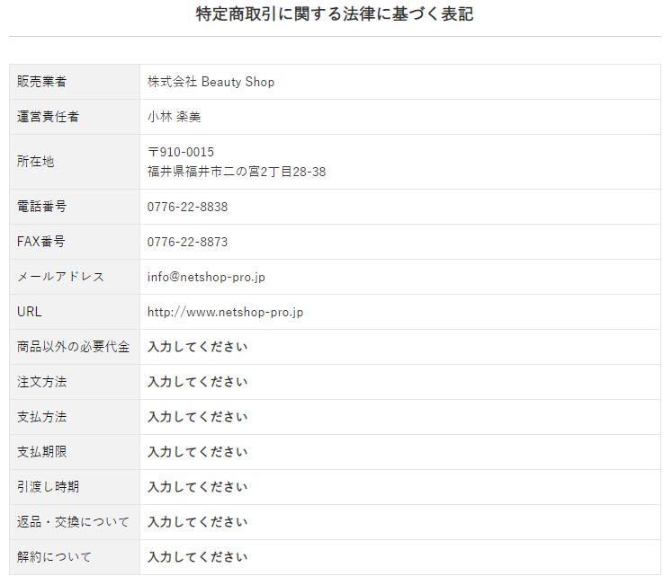 特定商取引法ページは項目の追加、削除やレイアウトの変更はできない仕様になっています。
