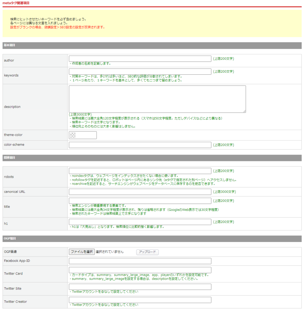 keywords ページの内容を表すキーワードを半角カンマ(,)区切りで入力してください。