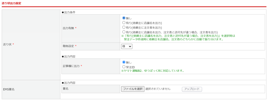 各配送業者の設定画面内「受注番号の印字」欄は必ず[受注ID]を選択してください。