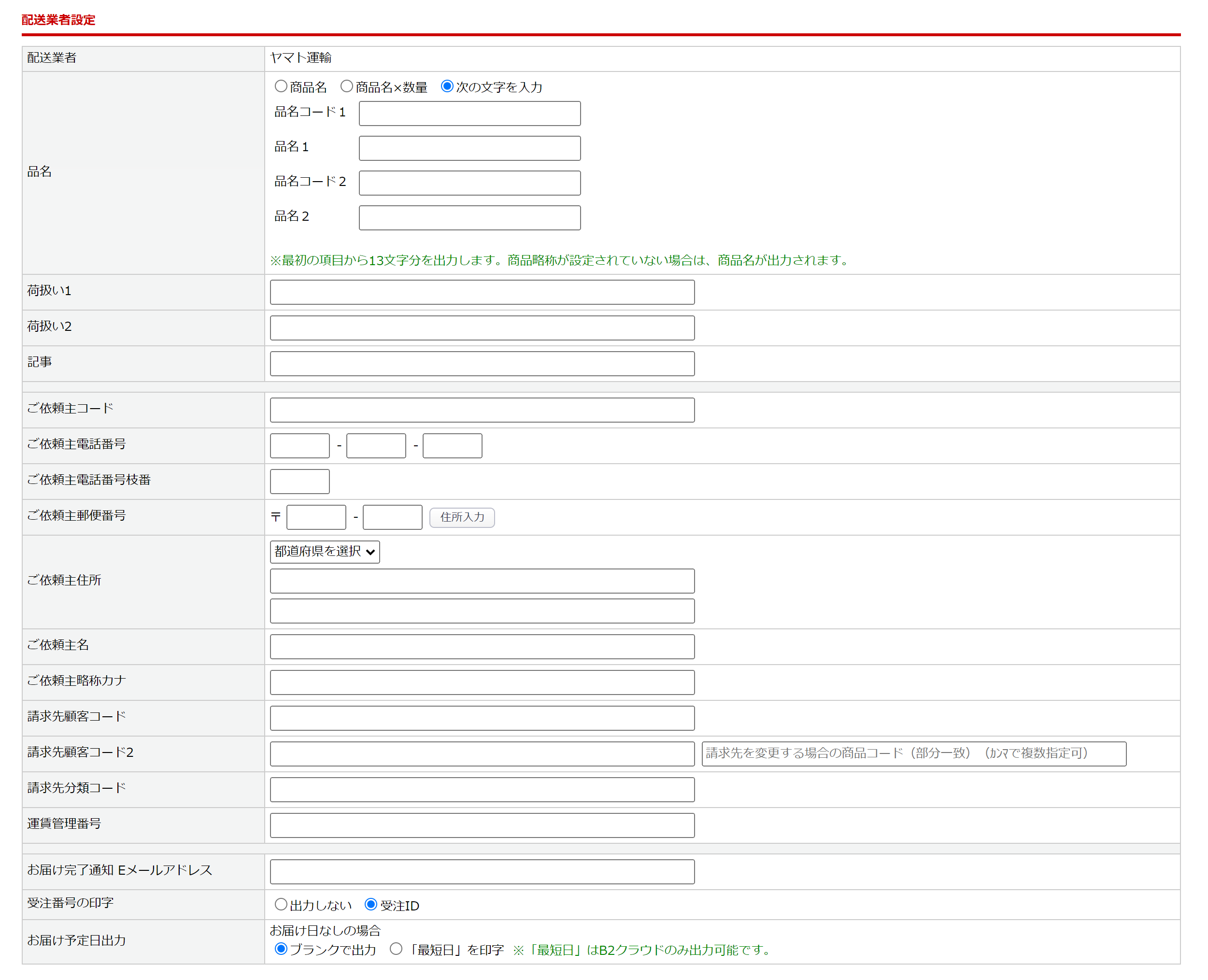 依頼主欄には同画面下部の配送業者別設定に設定した内容が反映されます。