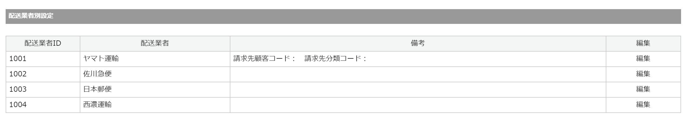 基本設定>配送業者設定>にて[利用する]になっている配送業者が表示されます。