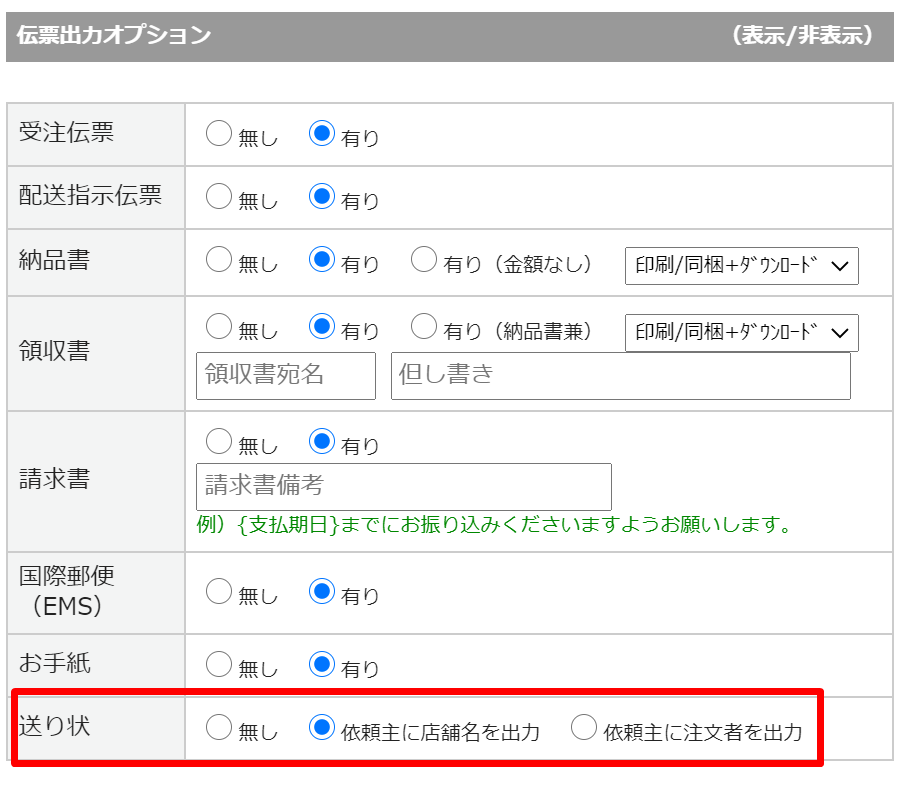 有り(依頼主に店舗名を出力、注文者と送付先が違う場合、注文者を出力)