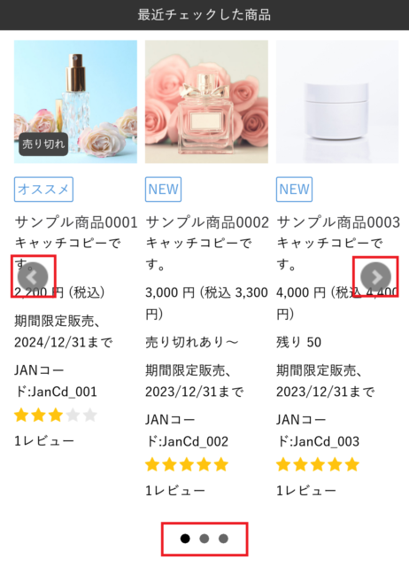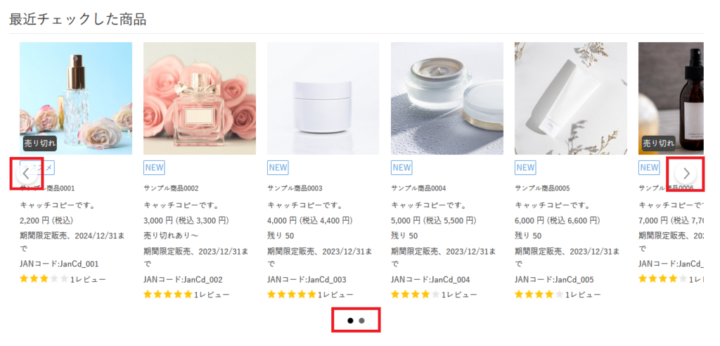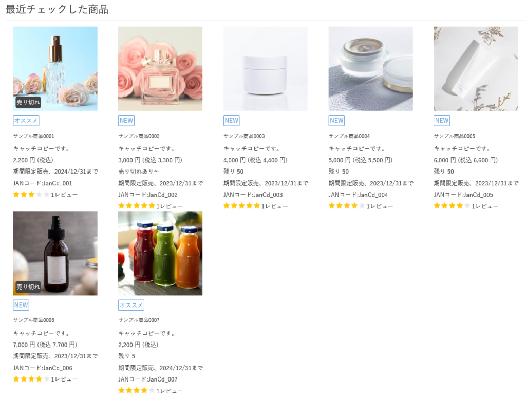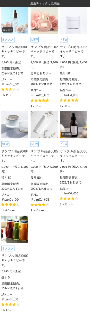 最近チェックした商品の各商品の各項目の表示はカテゴリーページの商品エリアと同様に表示されます。