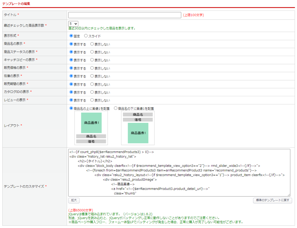 | 最近チェックした商品表示数 | 商品表示数を設定してください。 直近30日以内にチェックした商品を表示します。 |