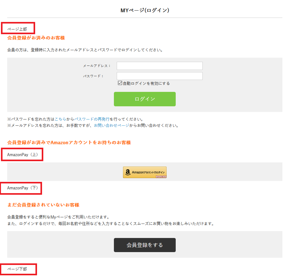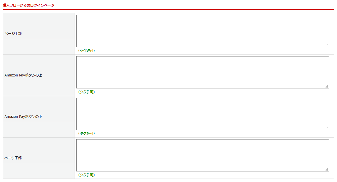 購入フローの途中で表示されるログインページにコメントを記載したい場合には、「購入フローからのログインページ」にご設定ください。