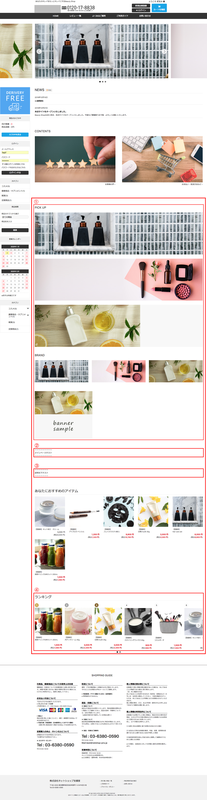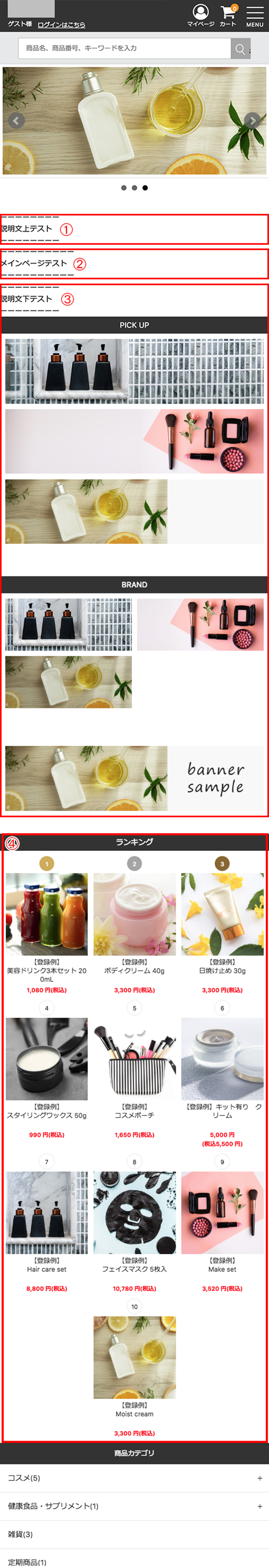 | 説明文下 | メインコンテンツとして、メインページに設定した下部に反映 TOPページデフォルト設定PC版③/SP版③ |
