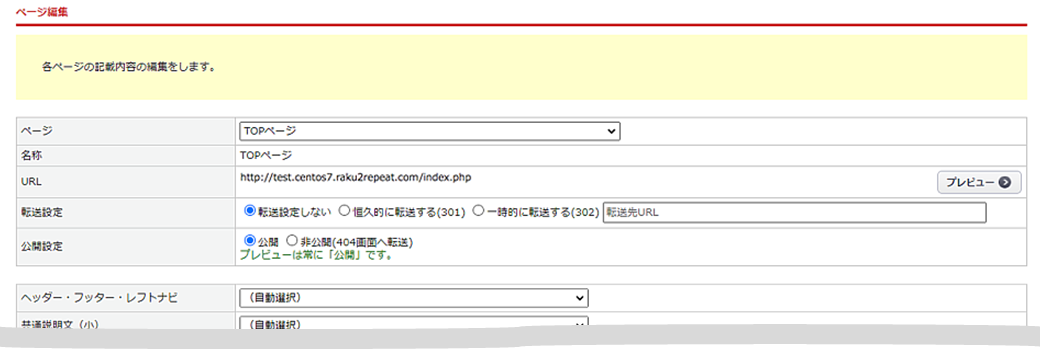 | 転送設定 | ページ転送の設定。 当該ページにアクセスされた際、別のページへ転送する場合は、 「恒久的に転送する(301)」または「一時的に転送する(302)」を 選択してください。※必ず転送先のURLを登録してください |