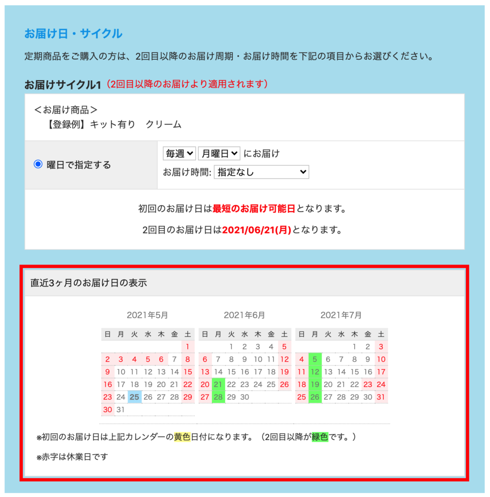 お届け日・サイクルのカレンダーを非表示にする場合は、CSSにて非表示にすることが可能です。