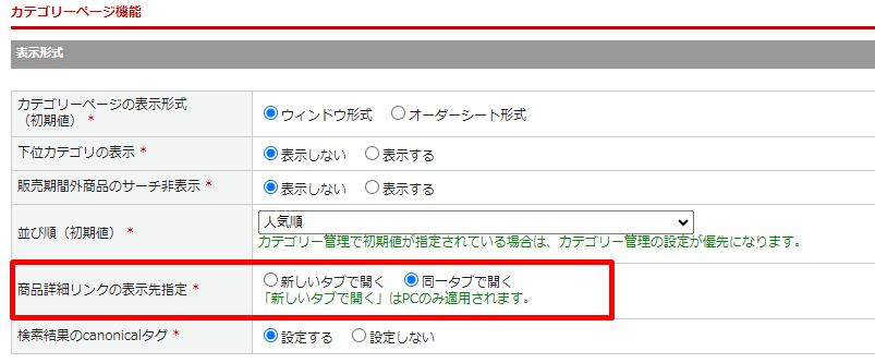 商品一覧ページで商品詳細リンクをクリックしたときに、商品詳細ページが同一タブで開くようになります。