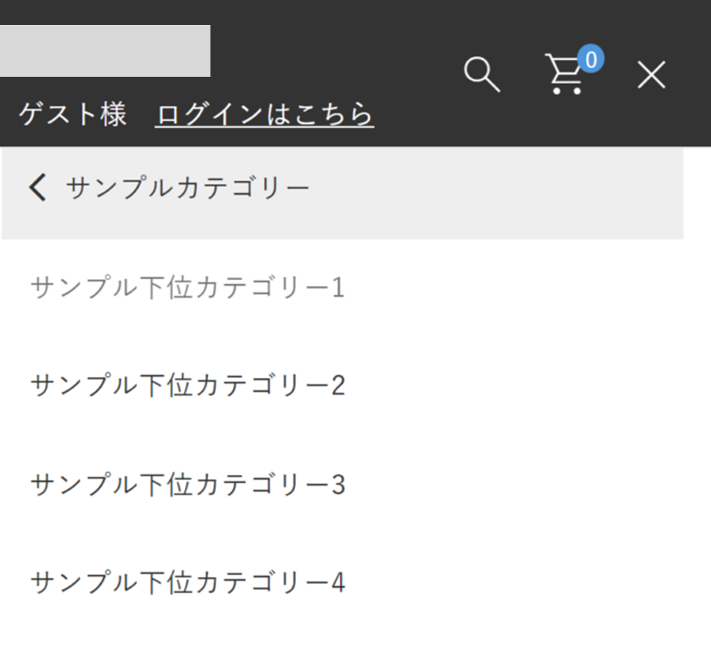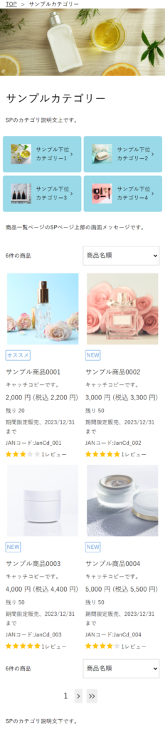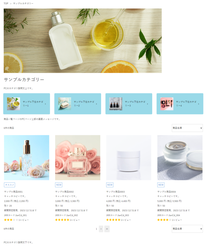 | 下位カテゴリー | 下位カテゴリーのカテゴリー名と画像が表示されます。 画像は、下位カテゴリーの出品>カテゴリー登録の「画像情報」の項目「画像」で設定した画像が表示されます。 下位カテゴリーの横幅はCSSを設定することで変更可能です。