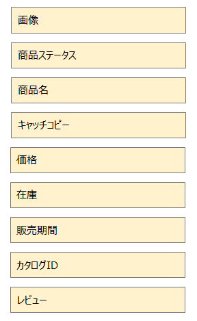 | カタログID | 商品のカタログIDが表示されます。 表示有無は、基本設定>カートシステム設定>[出品機能設定]タブの「項目表記」の項目「カタログID」で設定できます。 各出品商品の出品>出品商品登録>[基本情報]タブの項目「JanCd(カタログID)」の設定で表示されます。 |