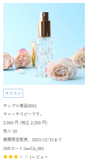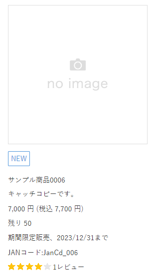 | レビュー | 商品のレビュー情報(満足度、レビュー数)が表示されます。 出品>カテゴリー登録の「表示内容設定」の項目「カテゴリ説明文下」の設定内容で表示されます。 |