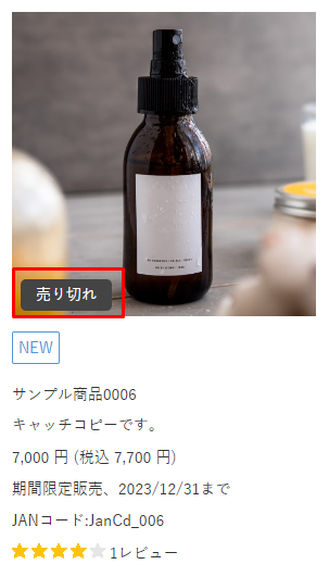 | 商品ステータス | 商品ステータスが表示されます。 商品ステータスは、出品>出品商品登録>[基本情報]タブの項目「商品ステータス」で設定できます。 旧レイアウトで自動表示している「のし対応可」「定期購入」「予約商品」は、新レイアウトでは表示されません。 |