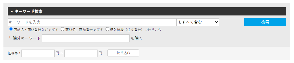 「ヘッダー検索」「検索ボックス」での検索は、基本設定>カートシステム設定>[出品機能設定]タブの「カテゴリーページ機能」の項目「検索対象とする項目」で設定した項目が検索対象の項目となります。