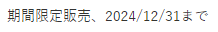 | 販売期間 | 商品の販売期間が表示されます。 表示有無は、基本設定>カートシステム設定>[出品機能設定]タブの「カテゴリーページ機能」の項目「販売期間表示」で設定できます。 各出品商品の出品>出品商品登録>[基本情報]タブの項目「販売期間指定」「注文ボタン」の設定内容より販売期間が表示されます。 表示パターン |