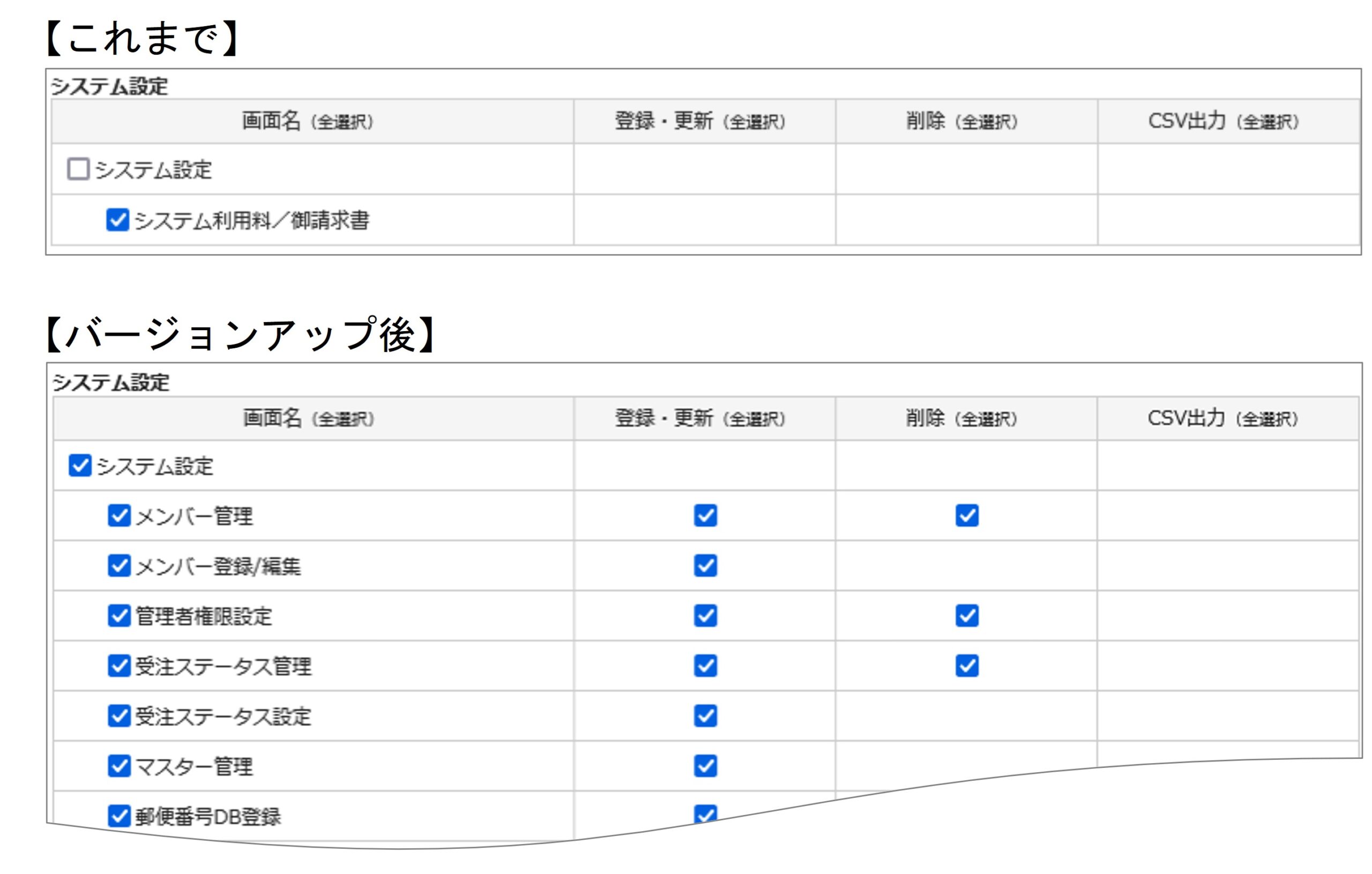 システム設定>管理者権限設定画面にて、システム設定のメニューについて、「システム利用料/御請求書」以外のメニューの権限設定が可能なよう改善されます。
