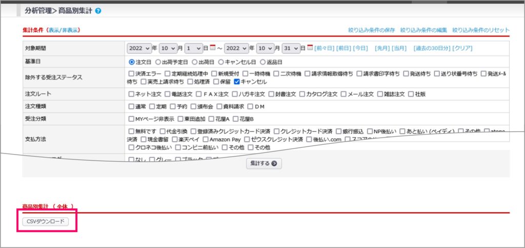 分析管理>商品別集計画面のCSVダウンロードボタンから出力されるCSVに「商品原価」が追加されます。