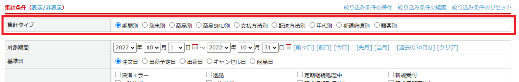 期間別、期間別端末別、商品別、支払方法別、配送方法別、年代別、都道府県別、顧客別集計画面が、受注集計画面の統合されます。 受注集計画面で集計タイプを指定して集計が可能となります。