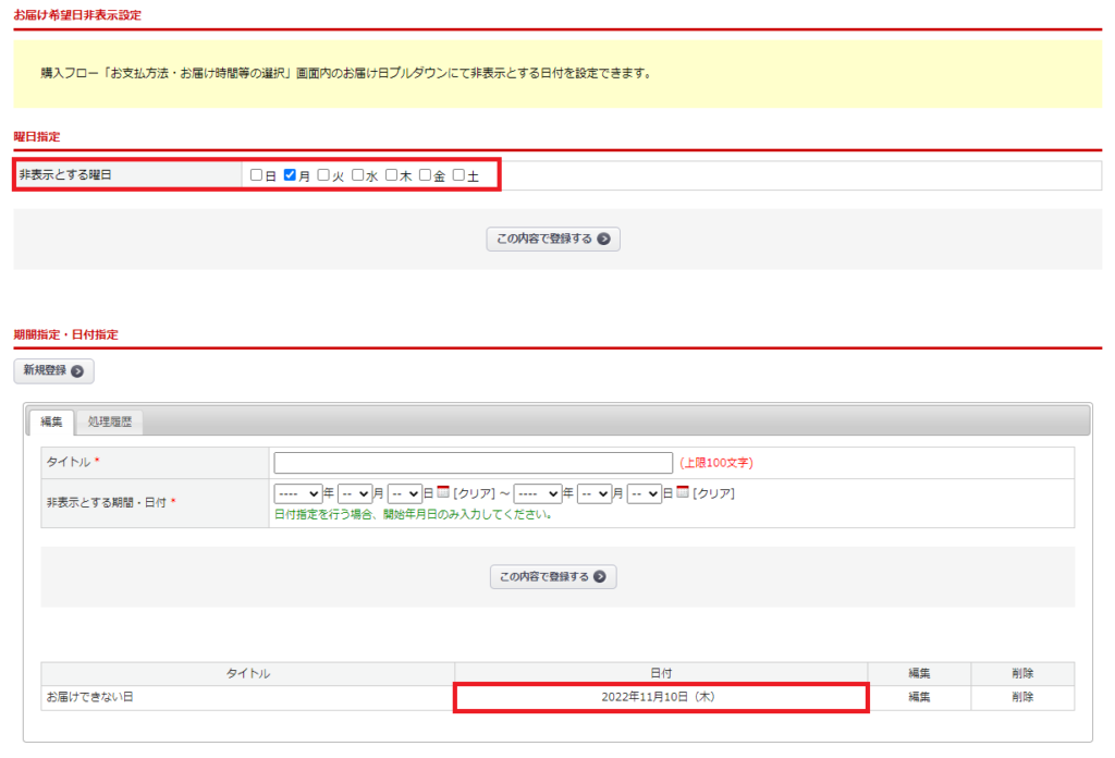 購入フローのお届け希望日の選択肢に表示しない日付を、期間指定、日付指定、曜日指定で、設定することが可能になります