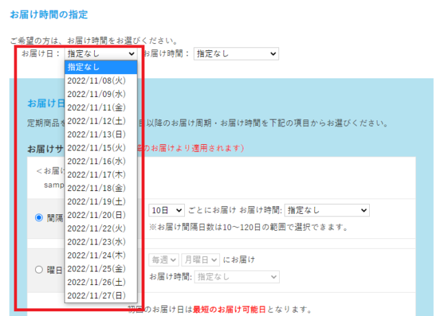 お届け希望日非表示設定で設定した曜日、日付が非表示となります。