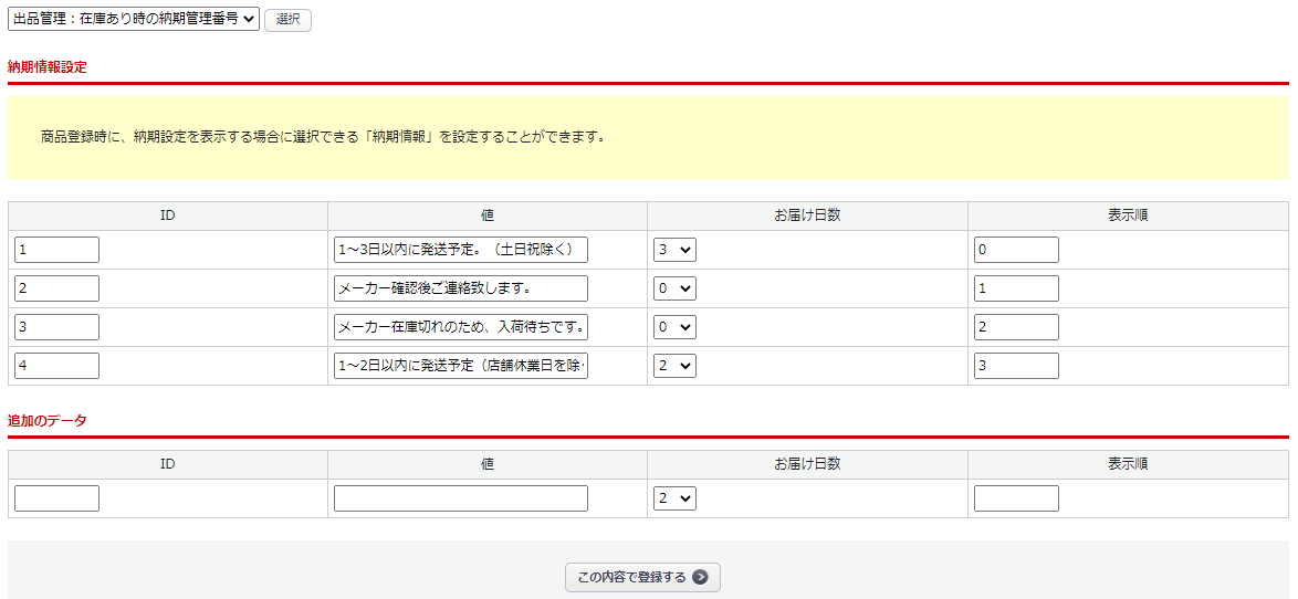 「出品管理:在庫あり時の納期管理番号」と「出品管理:在庫切れ時の納期管理番号」にて、表示させる文言とお届け日数を登録してください。