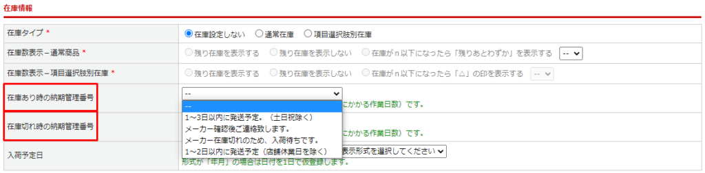 「在庫あり時の納期管理番号」と「在庫切れ時の納期管理番号」にて、表示させる文言を選択してください。