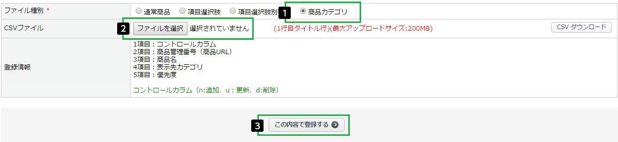 - 「ファイル種別」 より[商品カテゴリ]を選択して下さい。