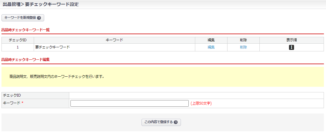 出品時チェックキーワードの登録・編集管理ができます。