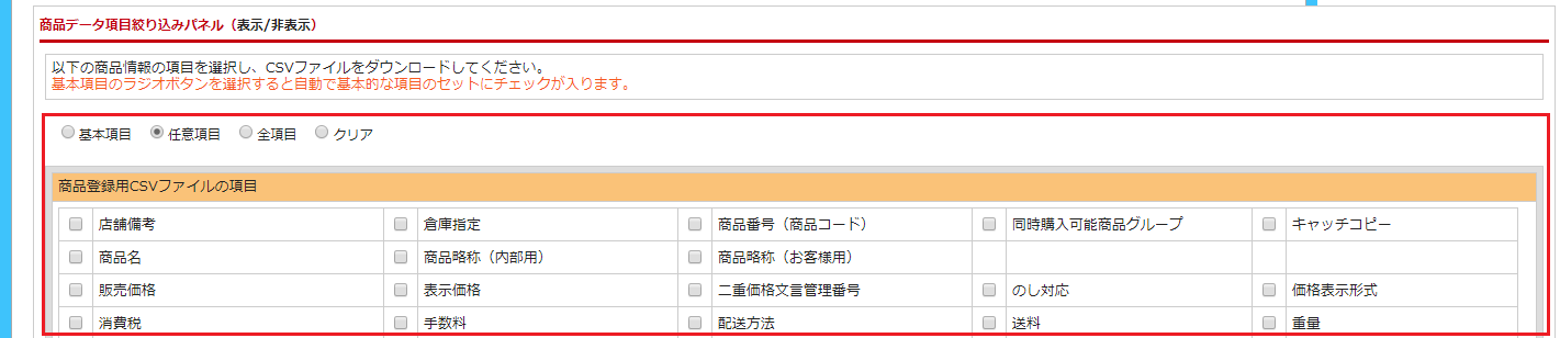 ※規格や選択肢を商品に登録したい場合は、通常商品の他に下記のCSVファイルの登録が必要です。