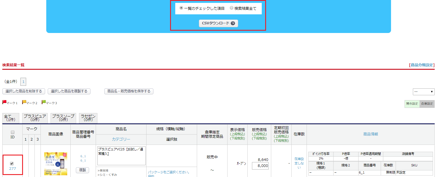 3. 商品を選択し、CSVダウンロードボタンをクリックしてください。