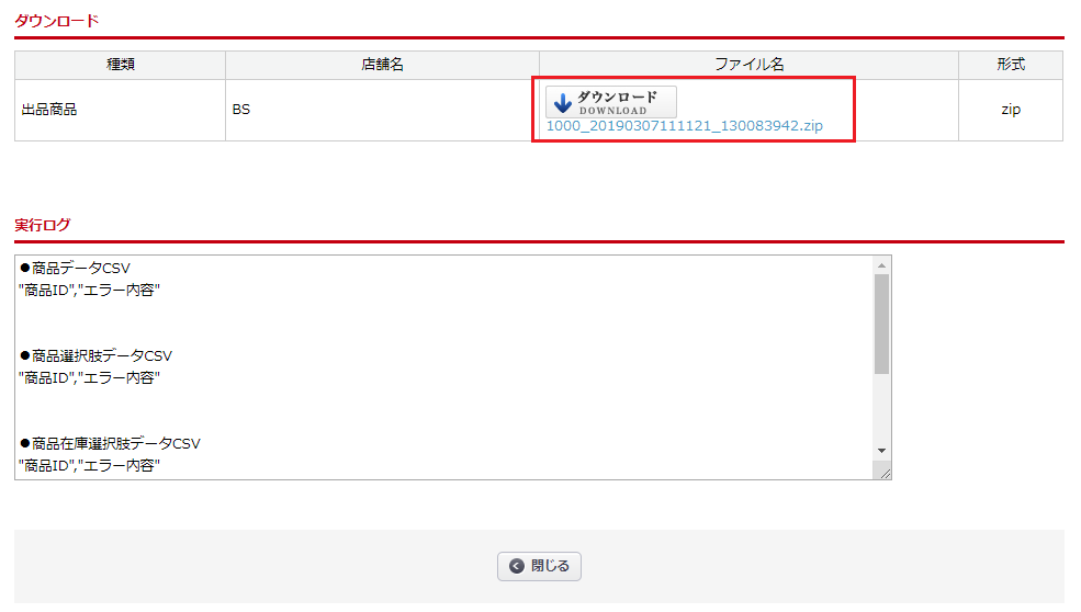 該当する商品をアップロードした際に、CSVアップロード履歴の[.csv.log]ファイルに