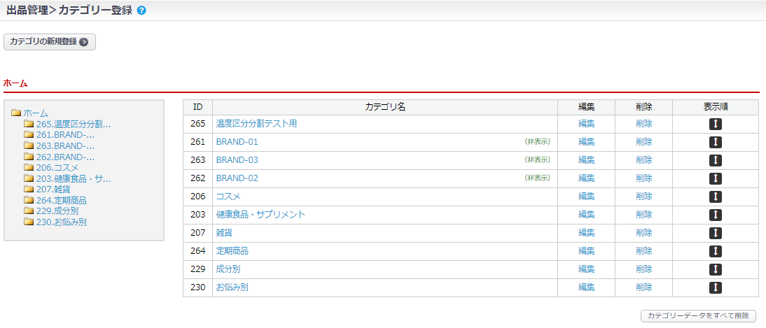 ※カテゴリの登録・削除は出品>出品登録画面からも可能です。商品にカテゴリを追加・削除した場合には、商品リストに商品が追加・削除されます。商品リストからカテゴリに商品を追加・削除した場合も同様です。