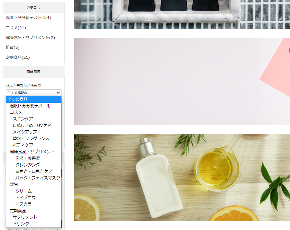 第2階層以下は「商品検索」ブロックの「商品カテゴリから選ぶ」に表示されます。