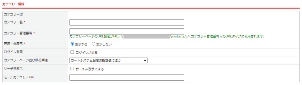 | カテゴリー管理番号 | カテゴリーページのURL設定が http://ドメイン/products/c/{カテゴリー管理番号}/ のURLタイプの場合に利用されます。任意の管理番号を入力してください。 ※「/(スラッシュ)」が入っていると、URLとして正しく機能しませんのでご注意ください。 |