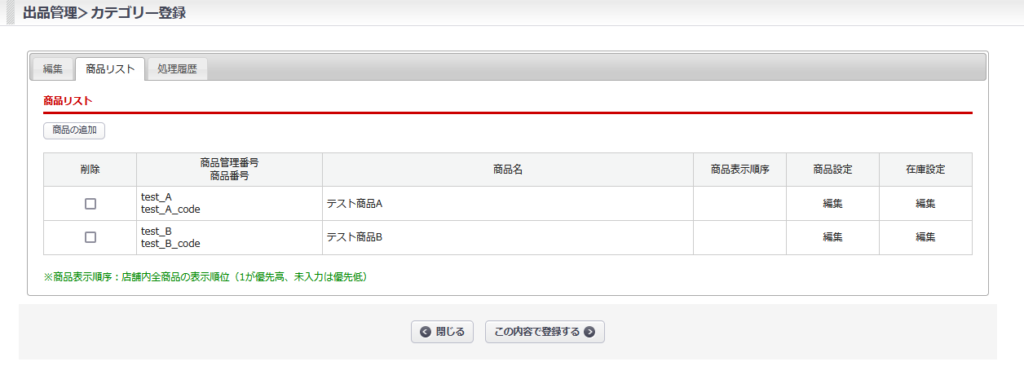 出品>カテゴリー登録 >【カテゴリの新規登録】>「商品リスト」タブ