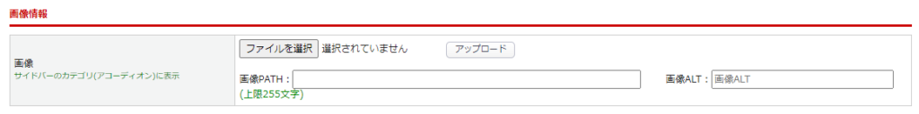 | 画像 | 画像を設定します。 設定した画像はサイドバーのカテゴリー(アコーディオン)や上位カテゴリーページで下位カテゴリの画像として表示されます。 【ファイル選択】と【アップロード】から画像を設定できます。 画像PATHと画像ALTを入力してください。 |