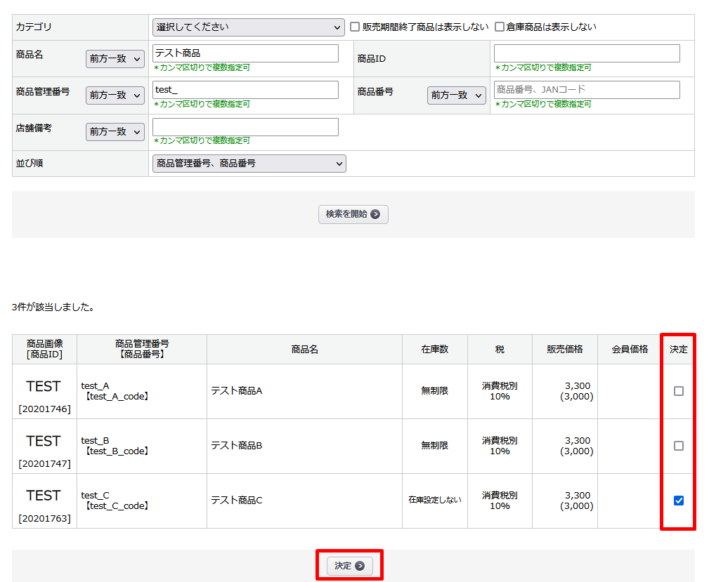 追加したい商品のチェックボックスにチェックを入れて、【決定】ボタンをクリックすると商品を追加することができます。