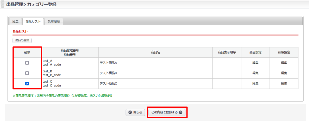 「商品リスト」タブにて、削除したい商品のチェックボックスにチェックを入れて、【この内容で登録する】ボタンをクリックすると商品を削除することができます。