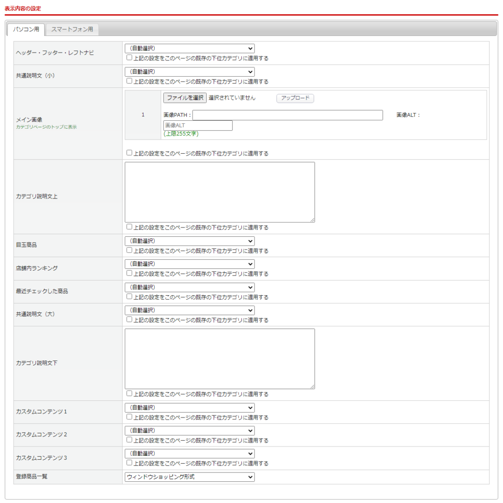 | 目玉商品 | 「デザイン(PC/SP)>ページ設定」と異なる 個別設定をする場合のみ変更してください。 表示したくない場合は、(表示しない)を選択してください。 ※初期設定は(自動選択)になっています。 |