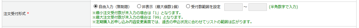1回の購入で販売できる個数を制限したい 公開日 : 2017年6月1日 / 更新日 : 2018年7月25日 出品関連 出品管理>出品商品登録 より設定可能です。 基本情報 – [注文受付形式]にて「受付数範囲を設定」を選択し、制限個数の上限、下限を入力して下さい。 この記事で解決しましたか? 〇 はい 0 × いいえ 1 「フロントページから見えない商品設定方法(サーチ非表示)」 「出品>再入荷管理」