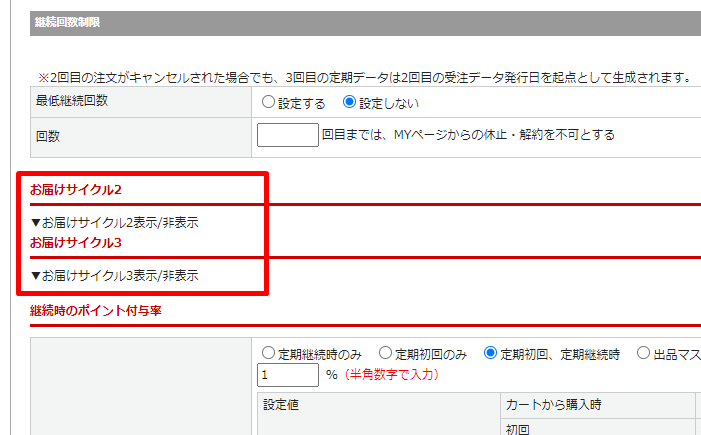 「▼お届けサイクル2表示/非表示」「▼お届けサイクル3表示/非表示」をクリックすると、